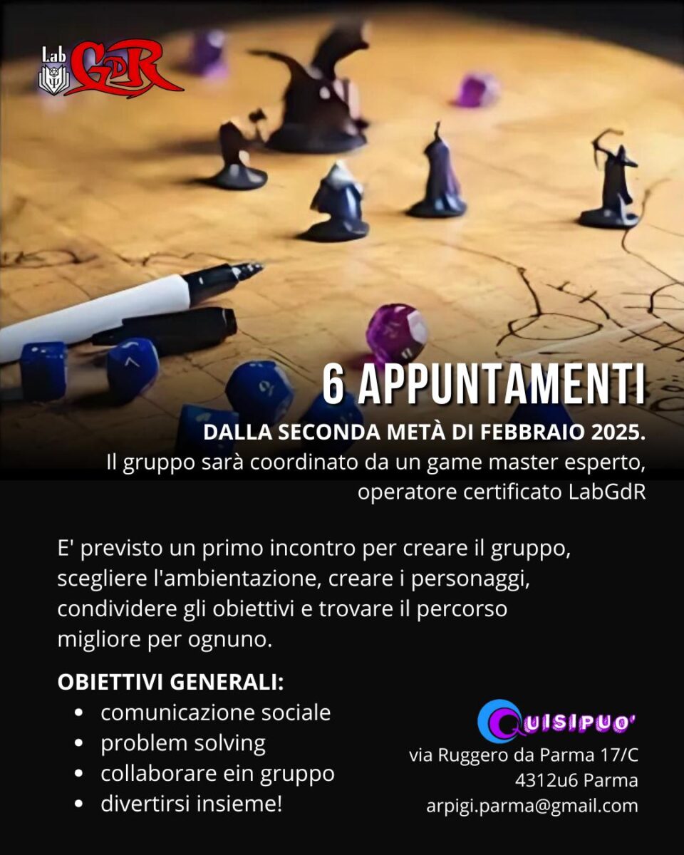 In collaborazione con la Cooperativa Quisipuò e grazie alla continua formazione e scambi che manteniamo con LabGdR, parte un nuovo gruppo di Giochi di Ruolo per adulti e giovani adulti.