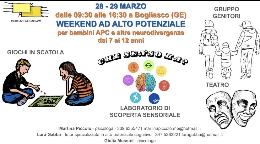 Ogni anno organizzo, con la preziosa collaborazione di famiglie e colleghi, alcuni weekend di laboratori per bambini ad Alto Potenziale Cognitivo e le loro famiglie.